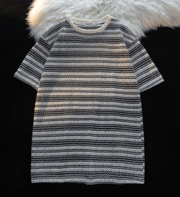 2024春夏新作メンズカジュアル半袖ニットトップス。シンプルでスタイリッシュなデザインが特徴のこのTシャツは、カジュアルな着こなしにぴったりです。暖かみのある素材感で、涼しい季節でも快適に着用できます。シンプルながらも洗練されたスタイルで、様々なコーディネートに合わせやすい1枚です。